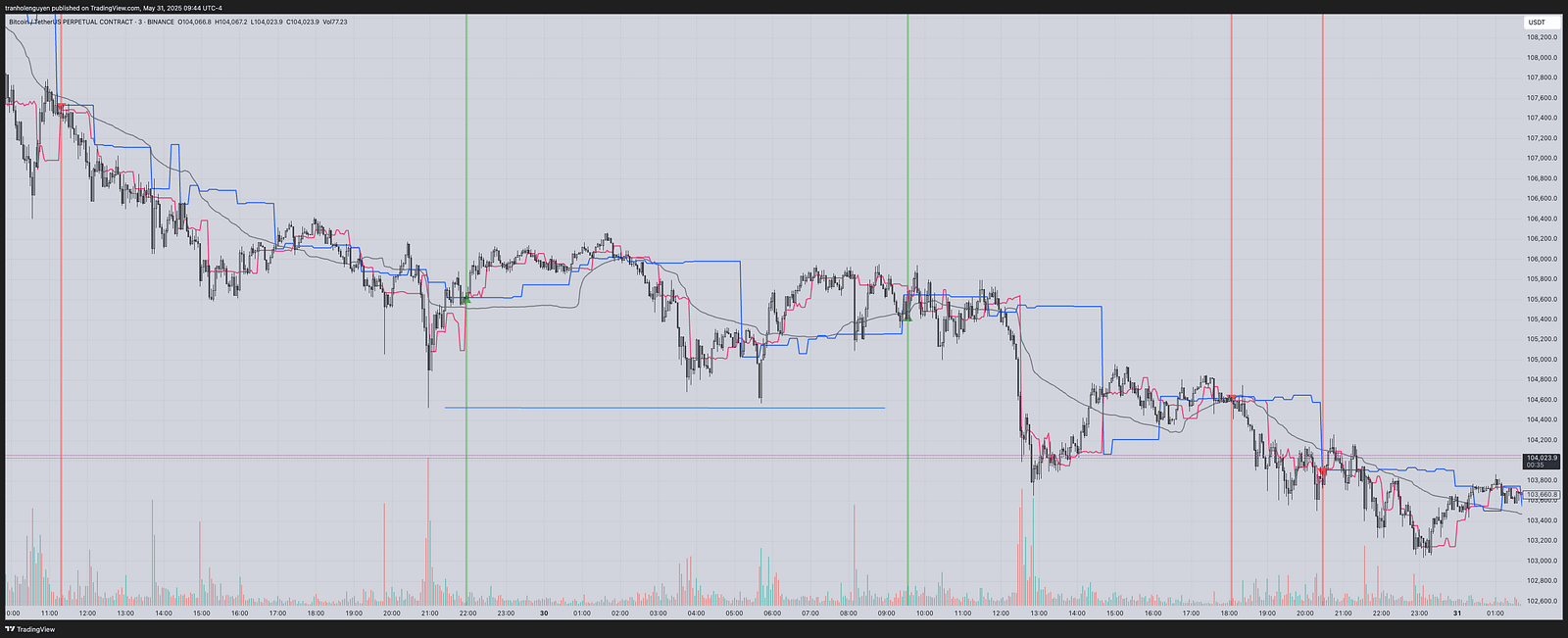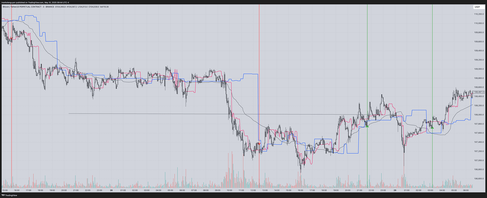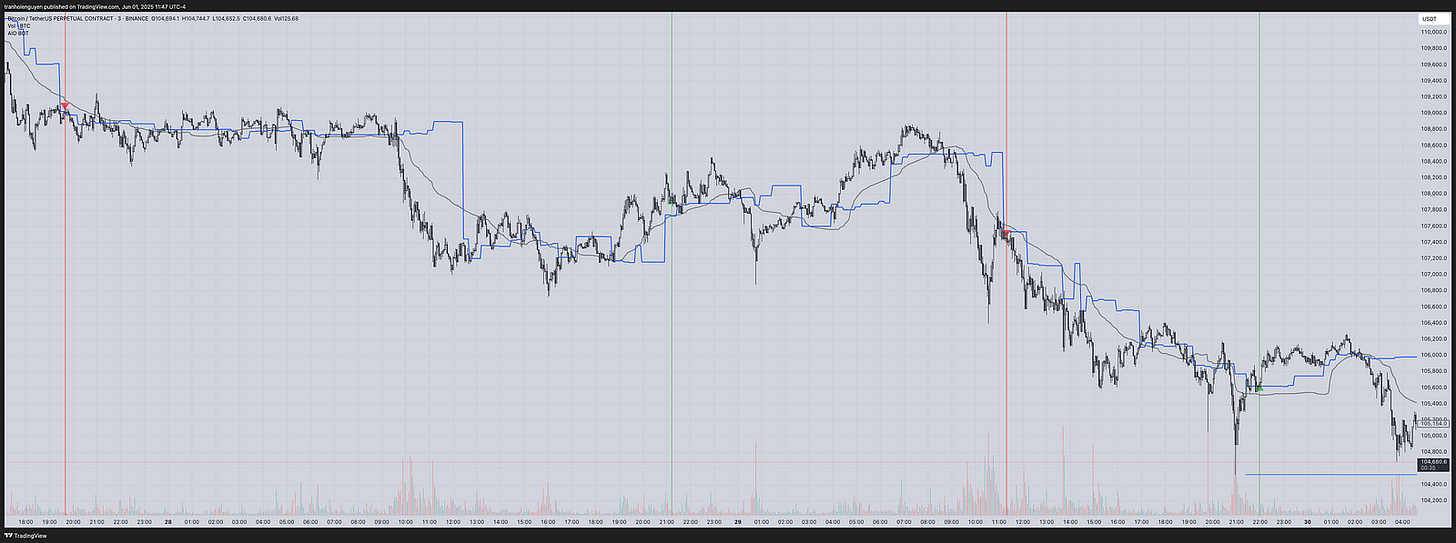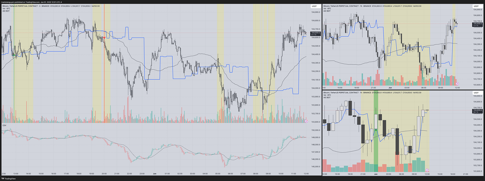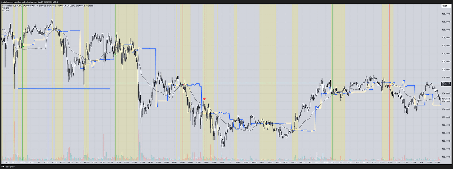 In general, AIO BOT is built based on the VWAP and the volume of price movement, which is shown through three main lines on the chart: