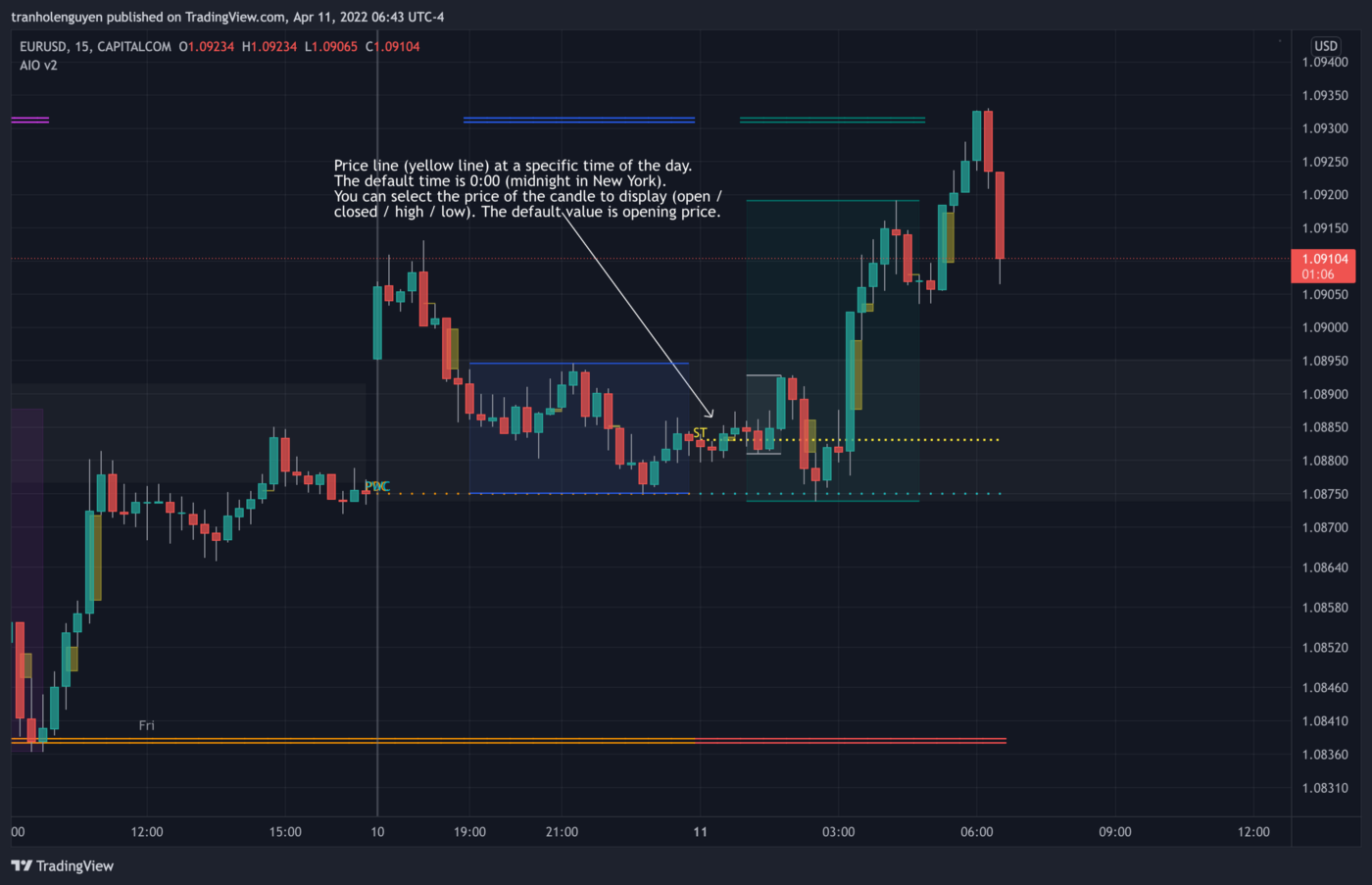 This indicator also has an option to show up to 2 price lines at a specific time, you can choose the price type (high/low/close/open) that you want to display. The default time values are: